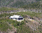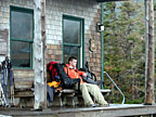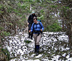 At around 3300' we encountered the first patches of snow. It really wasn't until we hit the Garfield Ridge trail that there was any sustained snow, but even then it was nothing you couldn't handle with bare boots. Meri and Nancy had long since sped ahead of me, so I found Pat and Teejay just before the hut and finished with them. We dumped our food loads on one of the tables, grabbed low altitude bunks, and changed clothes as appropriate. After a rest and some porch silliness, we looked around for something else to do that afternoon. Meri, Nancy, and I decided to head up to Galehead and then hang out on the view. It only takes 15 minutes to hit the uneventful summit of Galehead, so we quickly dropped down to the outlook where we practiced lounging. After a little while MEB showed up and hung with us for an extended lounge.