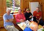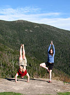 Back to the hut and an odd interlude of yoga and gymnastics on the lawn let to some steller photo ops. Then is was time to get ready for dinner. J&J, who had done the day's most obscure peak bagging of East and West Garfield, brought a variety of fun foods to play with. Crackers, cream cheese, parsley, goldfish, Old Bay seasoning, make for excellent artistic canvas, and our participants took full advantage. Bunchberry was generally considered to have won with her excellent representation of John. Seema had been working all afternoon in the kitchen with a team of sherpas preparing our fantabulous Thai dinner of Tom Yom soup, Drunken Noodles, and Pad Thai, which was consumed with great gusto. After a fine sunset, we finished dessert and started the many hiking related conversations that we are rampant in this group.
